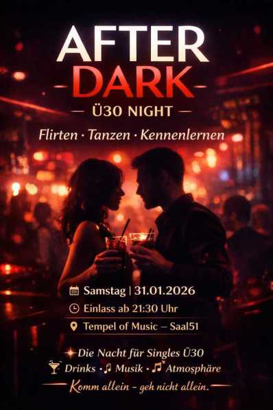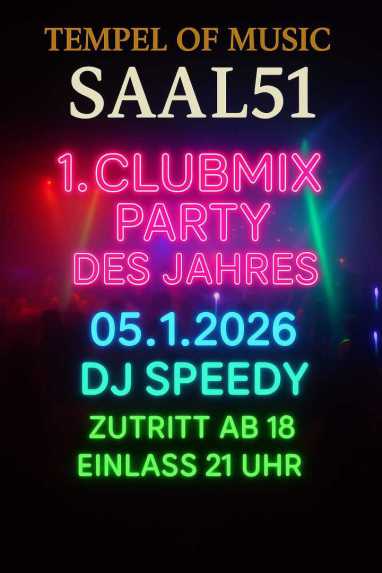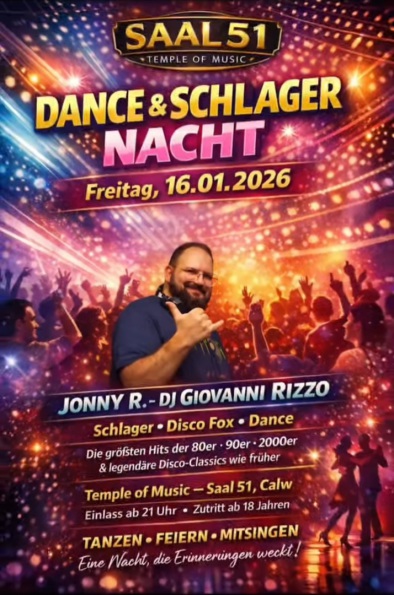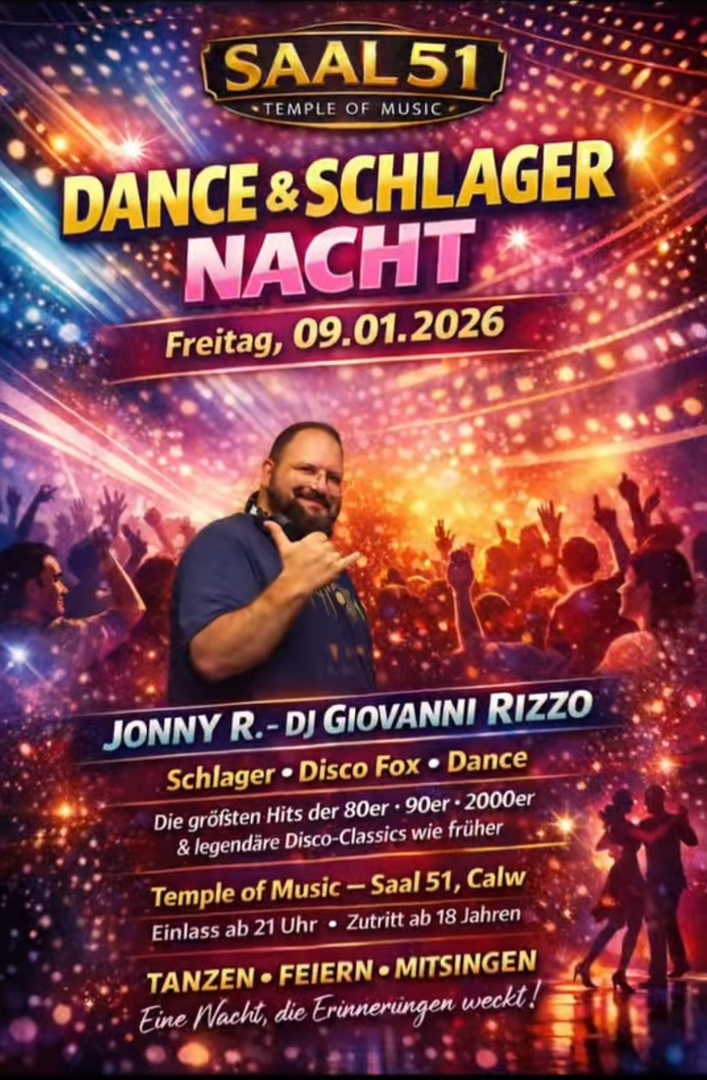 Dance & Schlager Nacht - Die Party, die Erinnerungen weckt Gute Musik, volle Tanzflächen und echte Disco-Vibes - die Dance & Schlager Nacht bringt das Lebensgefühl vergangener Partyzeiten zurück! Am Freitag, den 09.01.2026 und Freitag, den 16.01.2026 heißt es wieder Tanzen, Feiern und Mitsingen im Temple of Music - Saal 51 in Calw. Freut euch auf zwei unvergessliche Abende mit Jonny R. - DJ Giovanni Rizzo, der euch mit einem bunten, quergemischten Musikrepertoire durch mehrere Jahrzehnte Musikgeschichte führt. Von Schlager über Disco Fox bis hin zu Dance - mit den größten Hits aus den 80ern, 90ern und 2000ern sowie den legendären Disco-Zeiten wie früher, die wir gemeinsam wieder zum Leben erwecken.
