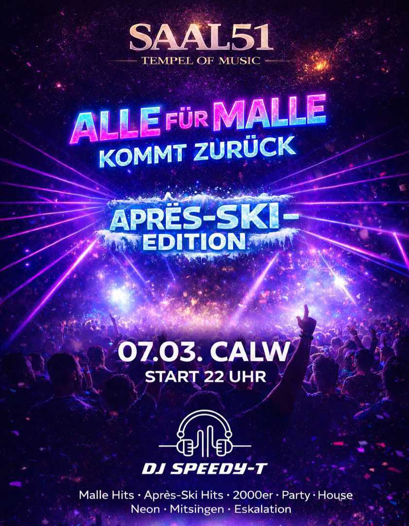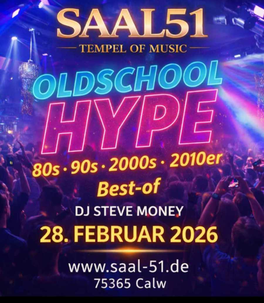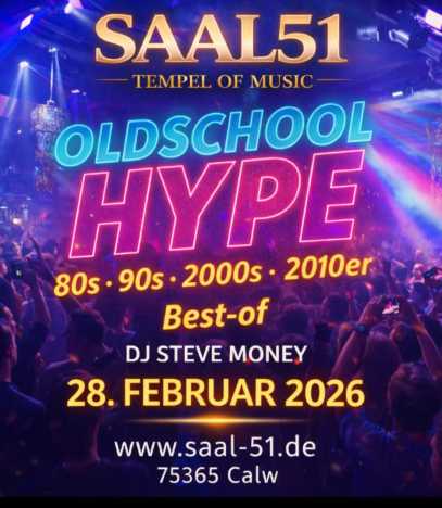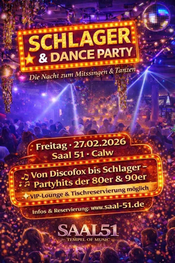 SCHLAGER & DANCE PARTY Die Nacht zum mitsingen & tanzen! Am Freitag den 27.02.2026 verwandelt sich der Saal 51 in Calw wieder in den Tempel der Schlager- und Partyhits! Freut euch auf eine unvergessliche Partynacht mit den größten Klassikern und den besten Tanztracks: Von Discofox bis Schlager - Partyhits der 80er & 90er Ab 21 Uhr bis Open End VIP-Lounge & Tischreservierung möglich. Perfekt für Geburtstage, Gruppen oder euren besonderen Partyabend!